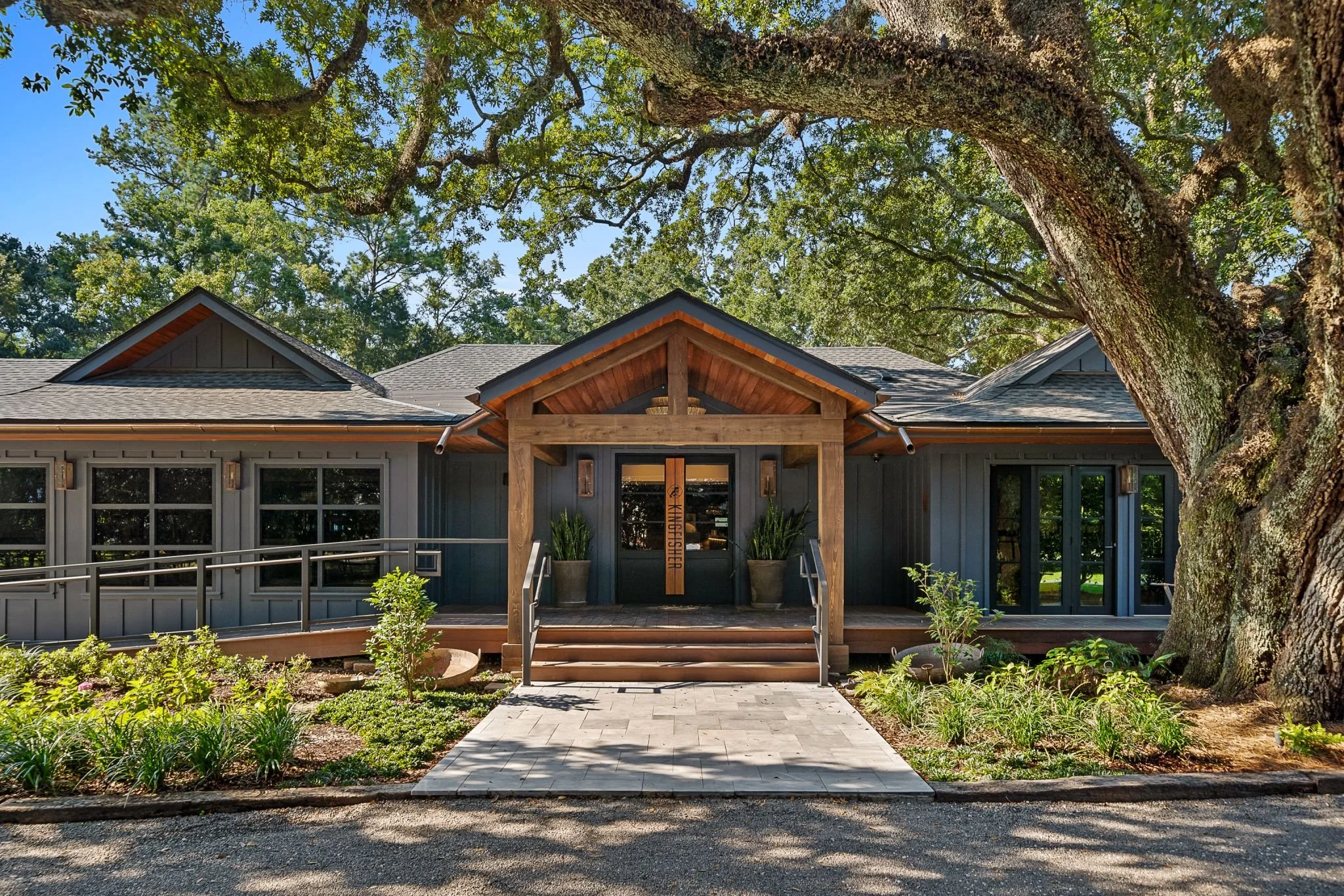 Kingfisher Restaurant blends the bold flavors of Louisiana with the laid-back coastal charm of Fairhope, Alabama. A renovation began on an existing commercial building in order to make it into the ideal low country restaurant with a variety of dining experiences. Blending Louisiana culture with that of a unique coastal town included also blending a multitude of design styles. While a coastal color palette is present throughout the restaurant with earth tones, blues, and whites, depending on the room the customer is seated in, the customer can have a completely different dining experience. This is true for the industrial inspired bar area and the wrap around porch and patio where you can find Fairhope’s famous bay breeze.